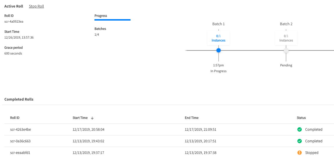 • STOPPED: The user manually stopped the roll. Nodes retain their current state when stopped, with no rollback to the initial configuration.